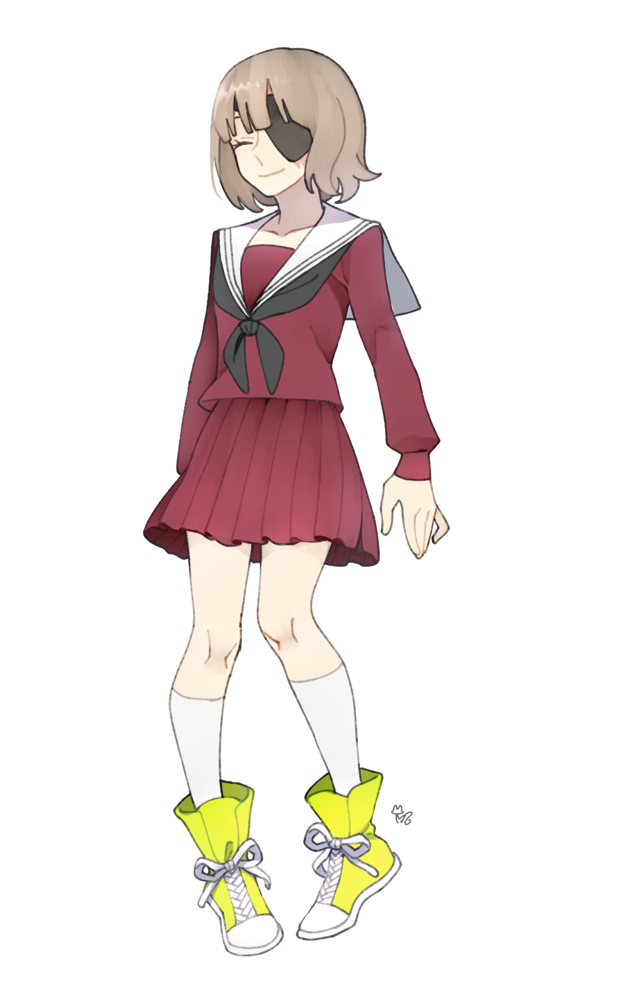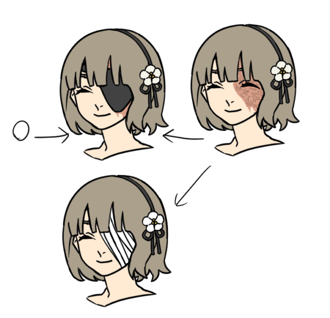 ねねに眼帯をつけることにしたので、立ち絵を描き直しました。 眼帯の裏には、事故で負ったひどい火傷の跡が残っています。 花飾りはなくすことにしました。 眼帯に花飾りもあるとごちゃごちゃするかなと思ったので。 前回のショート漫画で、花飾りについての話を描いたばかりなのに、変更してしまいました。 すいません…。